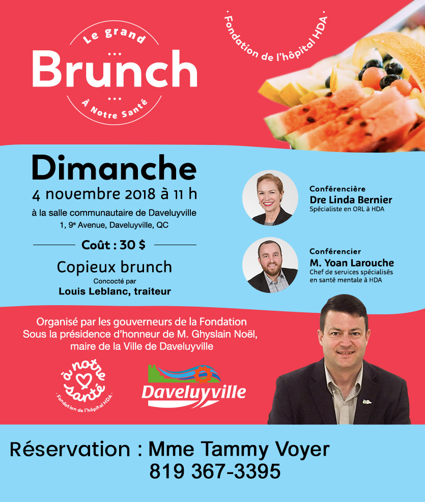 Daveluyville, le 10 septembre 2018 – Les gouverneurs de la Fondation À Notre Santé récidivent encore cette année en organisant la 3e édition du Grand brunch de la Fondation, activité qui a eu un incroyable succès les dernières années. Le brunch se déroulera le 4 novembre prochain, dès 11 h, au Centre communautaire de Daveluyville, sous la présidence d’honneur de M. Ghyslain Noël, maire de la Ville de Daveluyville.