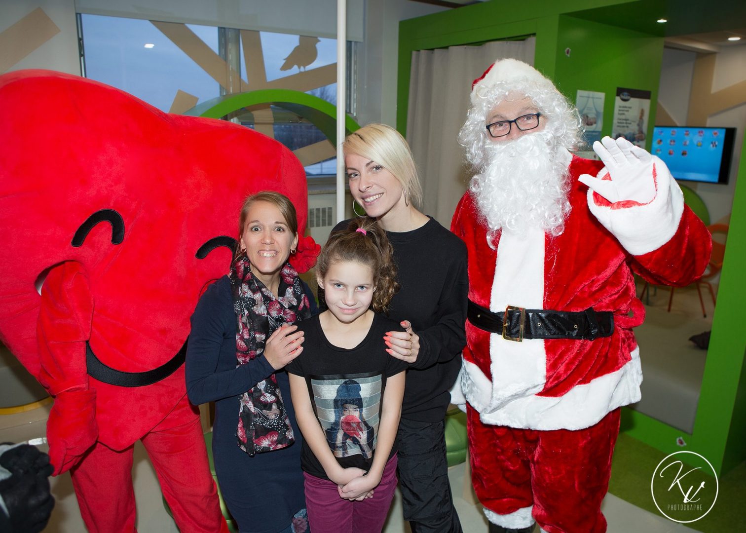 Sur la photo de gauche à droite : Vaincoeur (mascotte officielle de la Fondation À Notre Santé), Annick Héon (coordonnatrice aux événements de la Fondation), Zara Pouliot (greffée d’un nouveau cœur à l’âge de 13 mois), Marie-Mai et Père Noël (directement du Pôle Nord). Crédit photo: Karine Verville